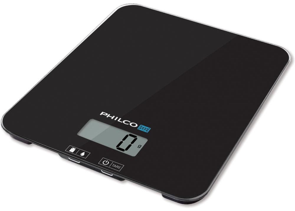 Digitální kuchyňská váha Philco PHKS 4511 v čistém minimalistickém designu s přehledným modře podsvíceným displejem.