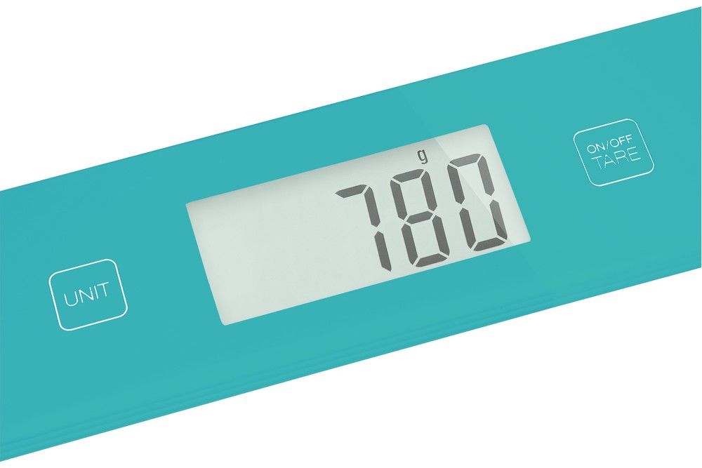 Barevná kuchyňská váha se skleněným povrchem a maximální nosností do 5 kg. Ultra slim design.