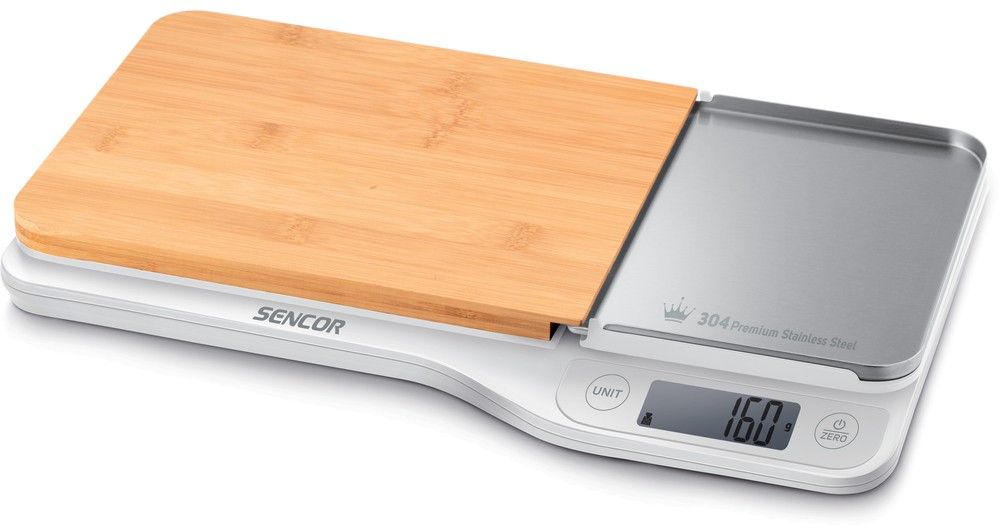 - Elektronická kuchyňská váha s bambusovým prkénkem a vyjímatelnou nerezovou miskou