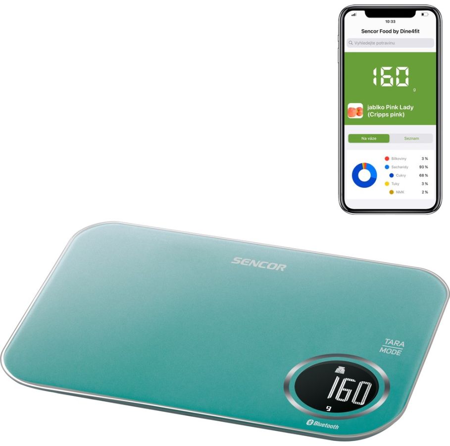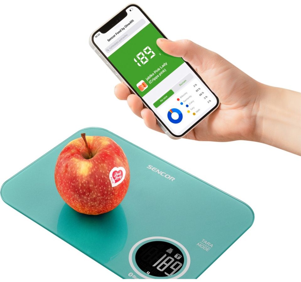 Váha nabízí širokou potravinovou databázi, kterou jinde jen tak nenajdete. Je v ní schováno více než 400 000 položek. Dochází k pravidelné aktualizaci a obsahuje perfektní přehled nutričních hodnot. Je propojena s originální a bezplatnou aplikací Sencor FOOD, na které se podíleli autoři hojně využívané aplikace Kalorické tabulky (Dine4FIT). V Kalorických tabulkách si pak lze vést záznamy navážených potravin a dlouhodobě sledovat přehled příjmu. Váha komunikuje s aplikací prostřednictvím Bluetooth a s vaším chytrým telefonem se spáruje automaticky.
