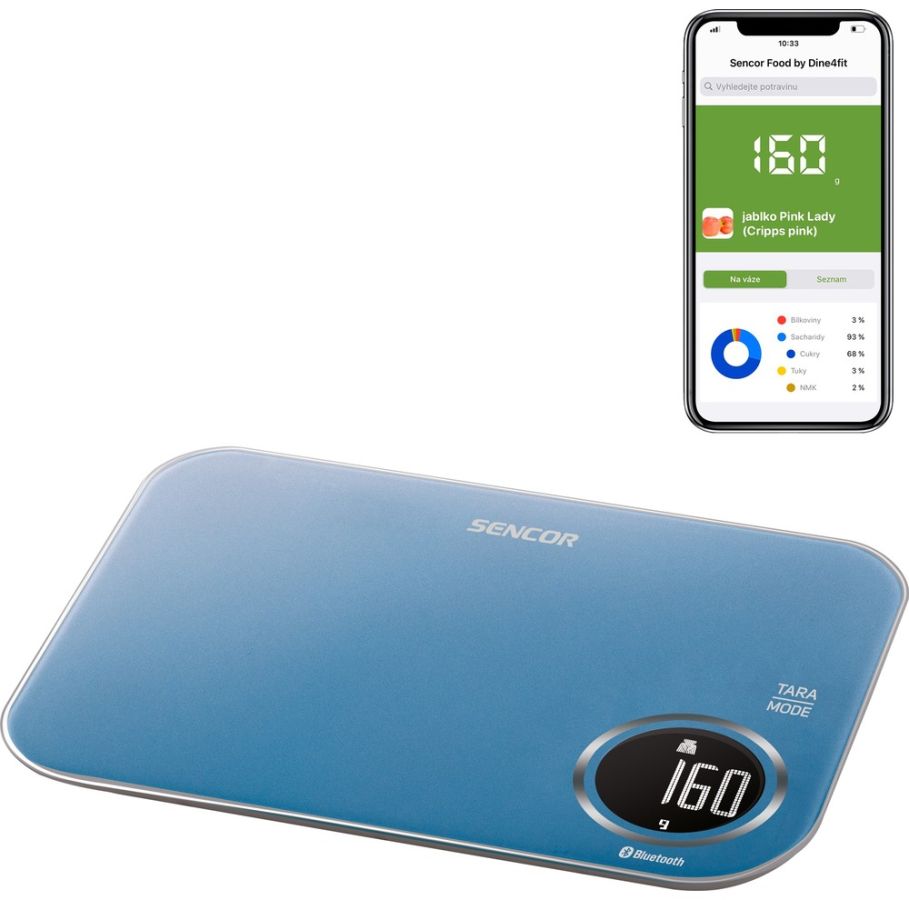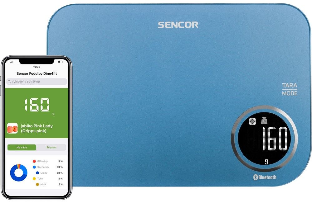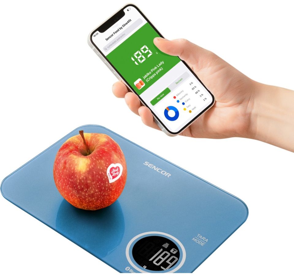 Váha nabízí širokou potravinovou databázi, kterou jinde jen tak nenajdete. Je v ní schováno více než 400 000 položek. Dochází k pravidelné aktualizaci a obsahuje perfektní přehled nutričních hodnot. Je propojena s originální a bezplatnou aplikací Sencor FOOD, na které se podíleli autoři hojně využívané aplikace Kalorické tabulky (Dine4FIT). V Kalorických tabulkách si pak lze vést záznamy navážených potravin a dlouhodobě sledovat přehled příjmu. Váha komunikuje s aplikací prostřednictvím Bluetooth a s vaším chytrým telefonem se spáruje automaticky.