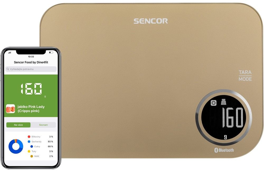 Váha nabízí širokou potravinovou databázi, kterou jinde jen tak nenajdete. Je v ní schováno více než 400 000 položek. Dochází k pravidelné aktualizaci a obsahuje perfektní přehled nutričních hodnot. Je propojena s originální a bezplatnou aplikací Sencor FOOD, na které se podíleli autoři hojně využívané aplikace Kalorické tabulky (Dine4FIT). V Kalorických tabulkách si pak lze vést záznamy navážených potravin a dlouhodobě sledovat přehled příjmu. Váha komunikuje s aplikací prostřednictvím Bluetooth a s vaším chytrým telefonem se spáruje automaticky.