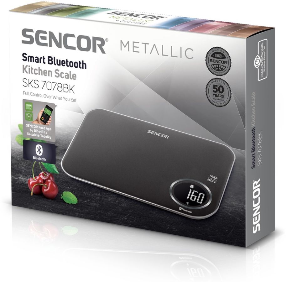Váha nabízí širokou potravinovou databázi, kterou jinde jen tak nenajdete. Je v ní schováno více než 400 000 položek. Dochází k pravidelné aktualizaci a obsahuje perfektní přehled nutričních hodnot. Je propojena s originální a bezplatnou aplikací Sencor FOOD, na které se podíleli autoři hojně využívané aplikace Kalorické tabulky (Dine4FIT). V Kalorických tabulkách si pak lze vést záznamy navážených potravin a dlouhodobě sledovat přehled příjmu. Váha komunikuje s aplikací prostřednictvím Bluetooth a s vaším chytrým telefonem se spáruje automaticky.