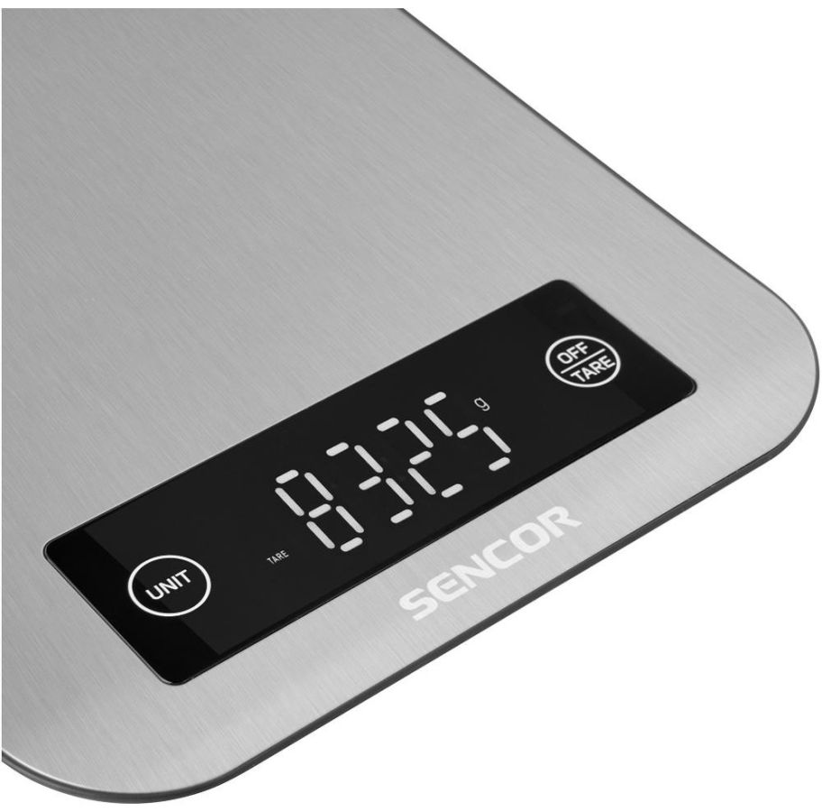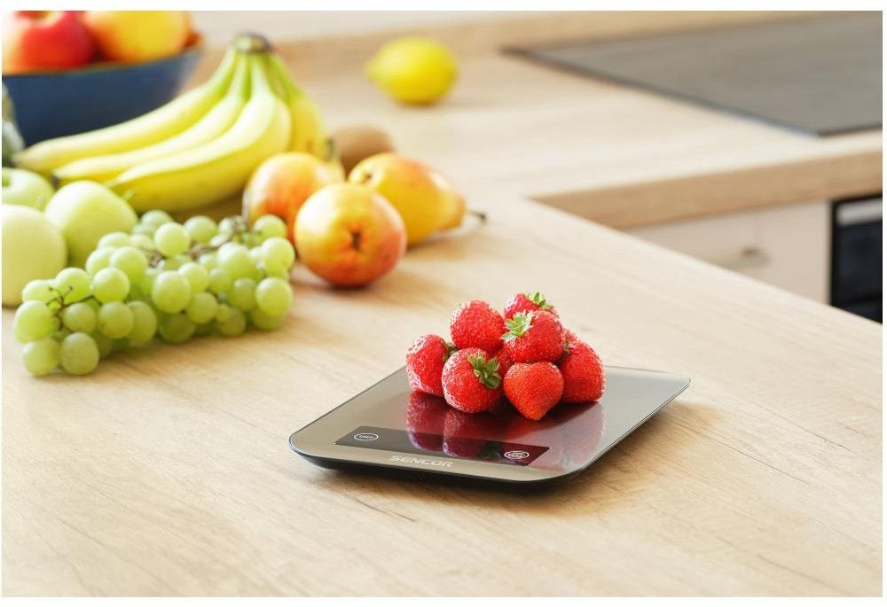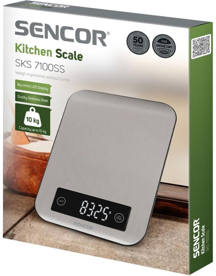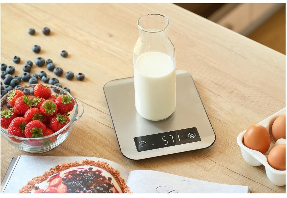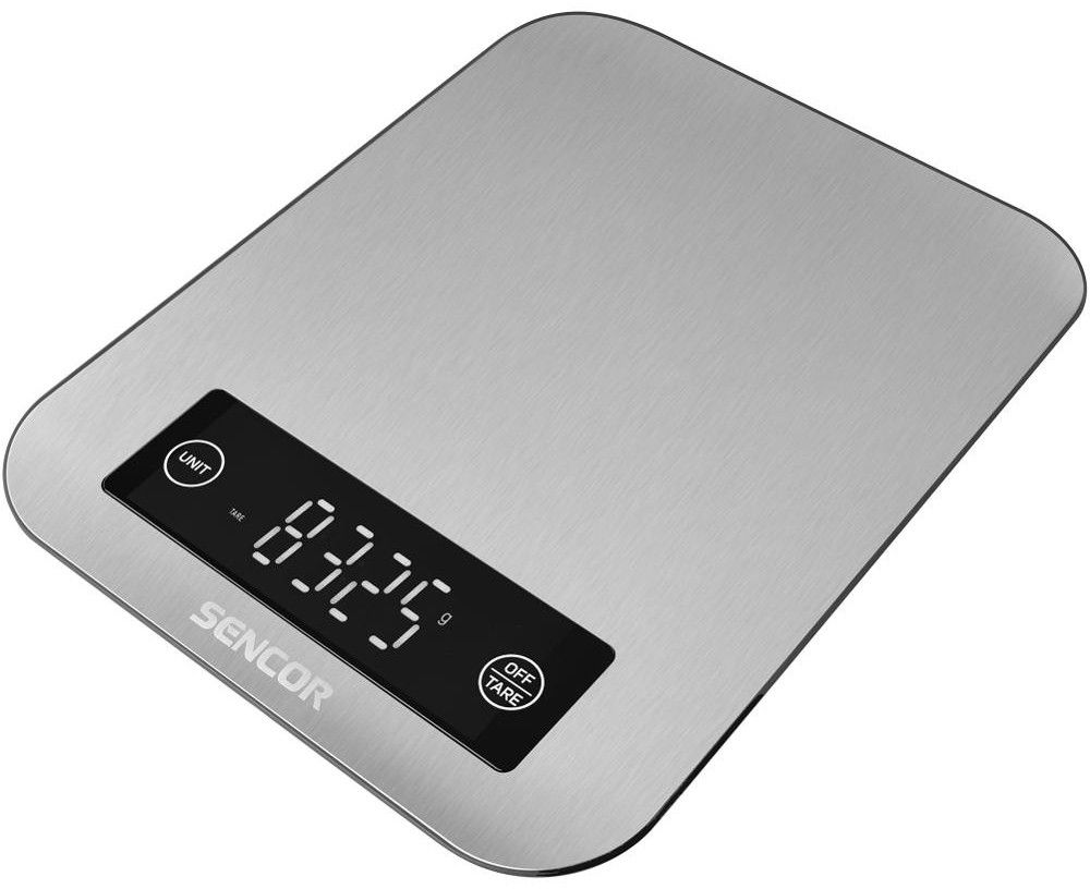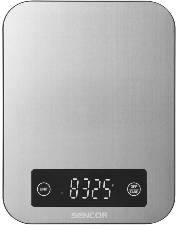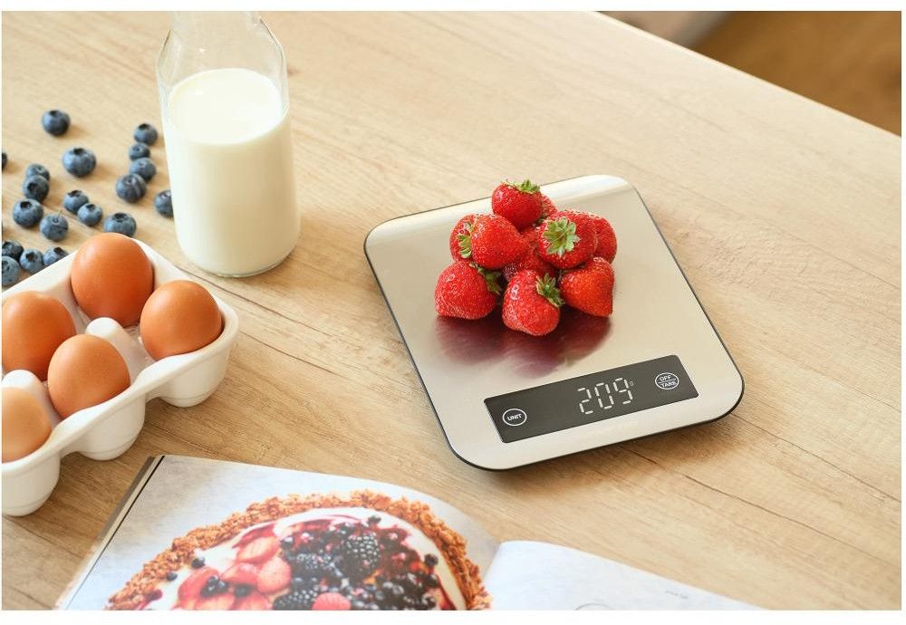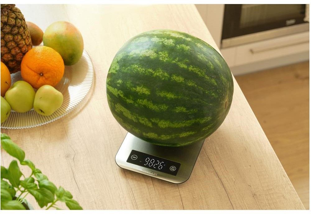 Kuchyňská váha s nerezovým povrchem, LED displejem a nosností do 10 kg.