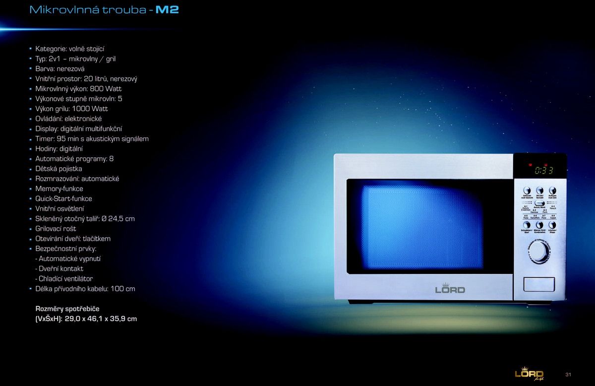 Mikrovlnná trouba LORD M2 zdravý požitek za minutu.Tato trouba nabízí 8 automatických programů. Digitální multifunkční displej, mikrovlny /gril, 20 litrů.