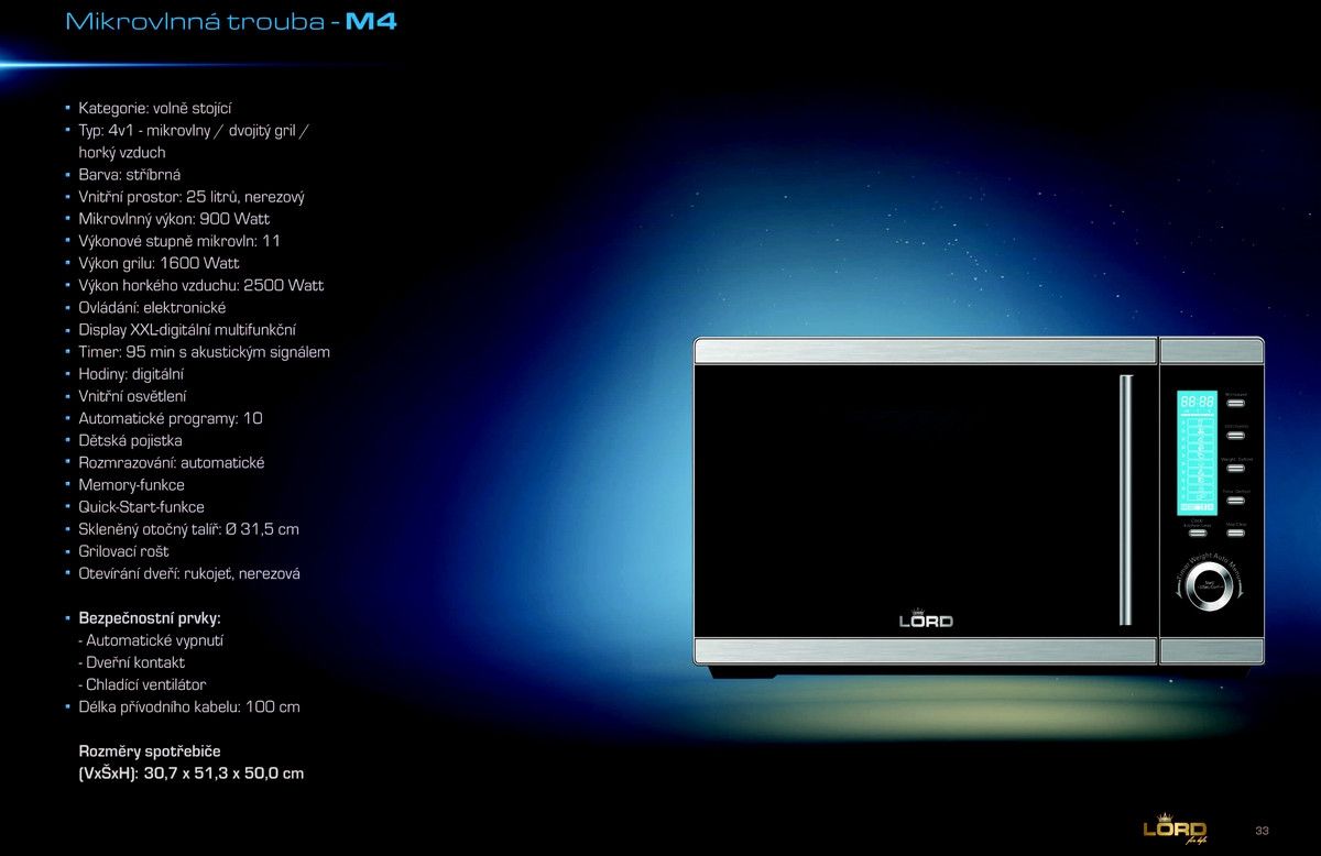 Mikrovlnná trouba LORD M4 zdravý požitek za minutu. Tato trouba nabízí 10 automatických programů. Digitální multifunkční displej, mikrovlny / dvojitý gril / horký vzduch, 25 litrů.
