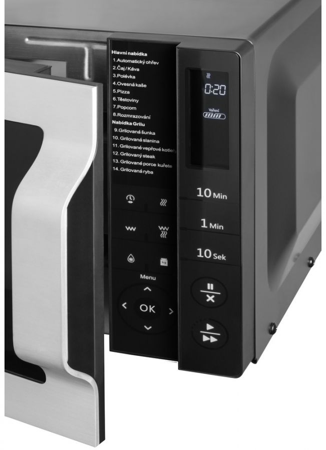 Mikrovlnná trouba s grilem s vnitřním objemem 25 l. Má 14 automatických programů a 6 úrovní výkonu.