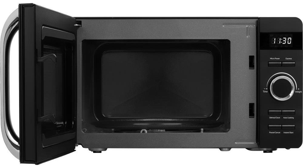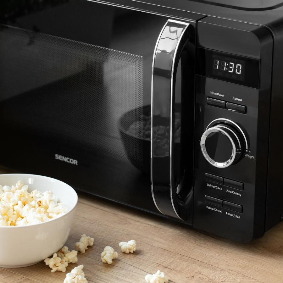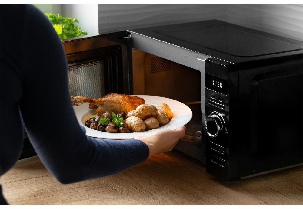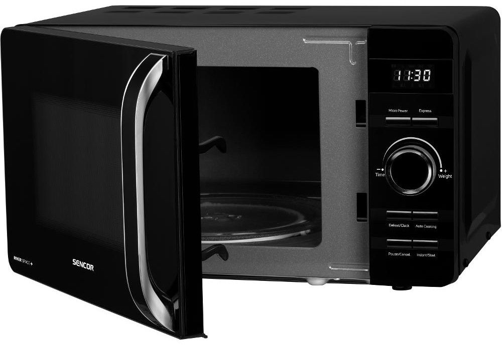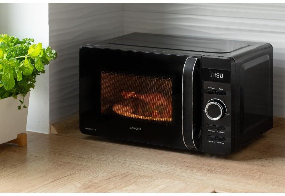 Mikrovlnná trouba s vnitřním objemem 17 l, 8-mi programy a 5-ti úrovněmi mikrovlnného výkonu.