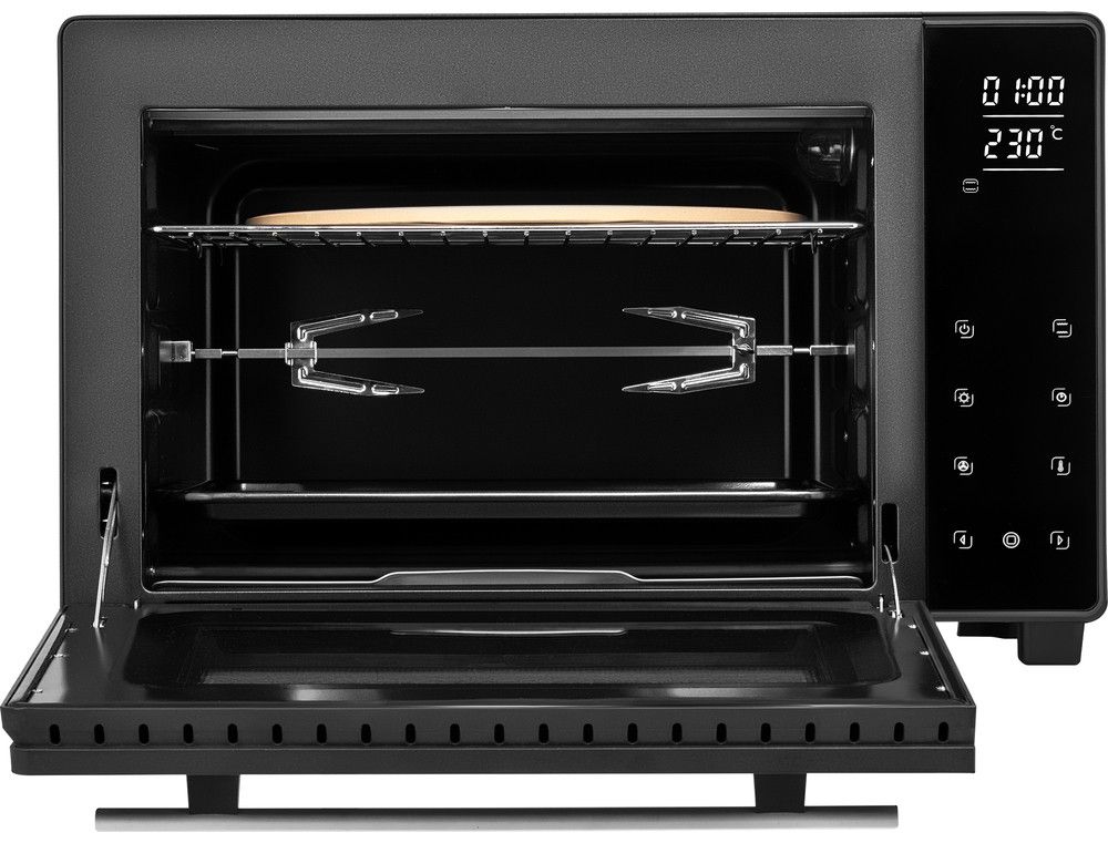 Elektrická digitální mini trouba s objemem 35 l, 9 přednastavitelnými programy a 150minutovým časovým spínačem.