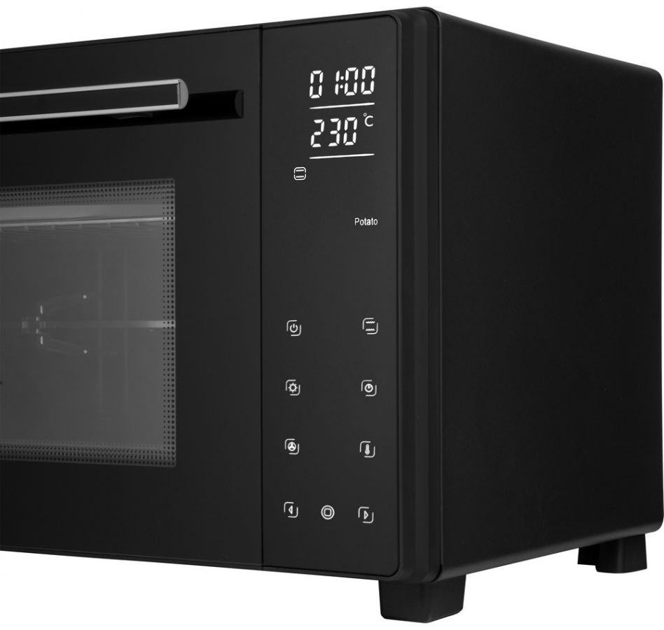 Vedle předních dvířek naleznete přehledný displej, který ukazuje čas, teplotu a typ ohřevu. Dotekové ovládání zajistí rychlou a snadnou volbu programu. Jednoduše si vyberete z nabízených programů či si zvolíte vlastní. V případě, že si vyberete vlastní program, můžete si navolit teplotu v rozmezí 30-230 °C a časovačem nastavit délku přípravy, a to až do 150 minut. Trouba je ideálním pomocníkem pro přípravu různorodých pokrmů pro každý den.
