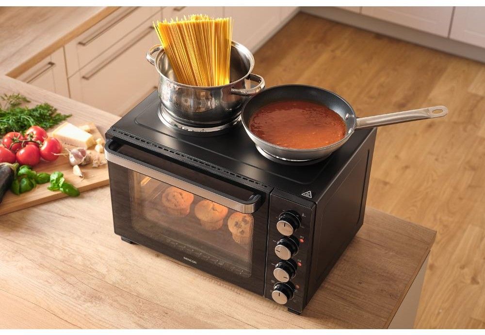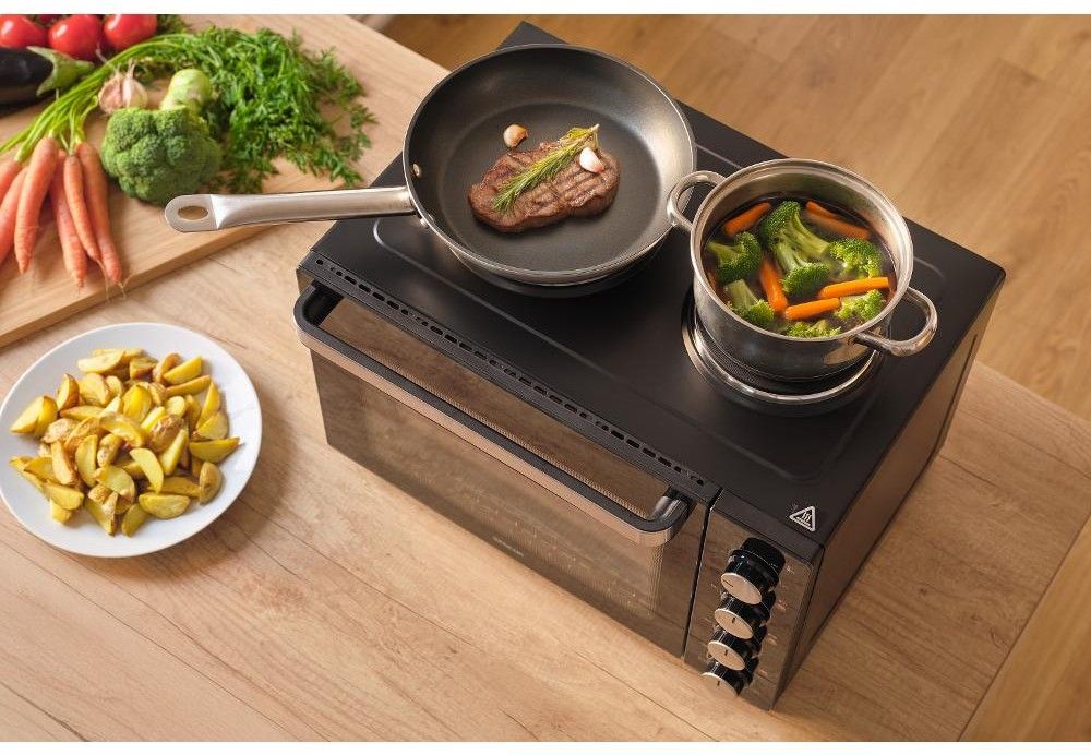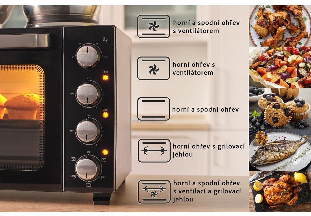Elektrická mini trouba o objemu 35 litrů s otočným ovladačem s 5 volitelnými programy a integrovaným vnitřním osvětlením.