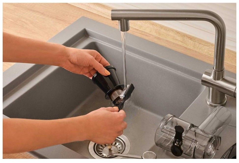 Po použití odšťavňovač rychle a bez námahy rozeberete. Plastové díly můžete umýt v myčce a ostatní komponenty stačí opláchnout teplou vodou. Pro důkladné odstranění nečistot můžete použít i praktický čisticí kartáček, který je součástí balení