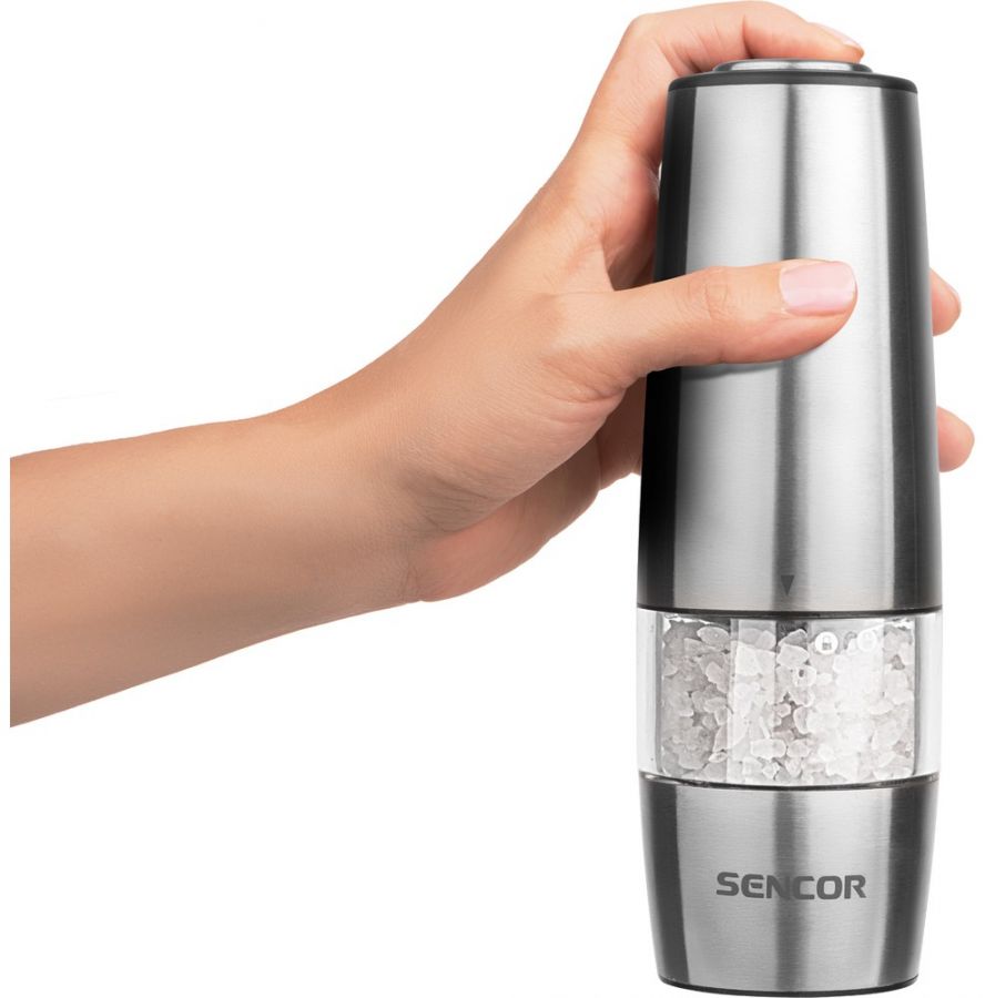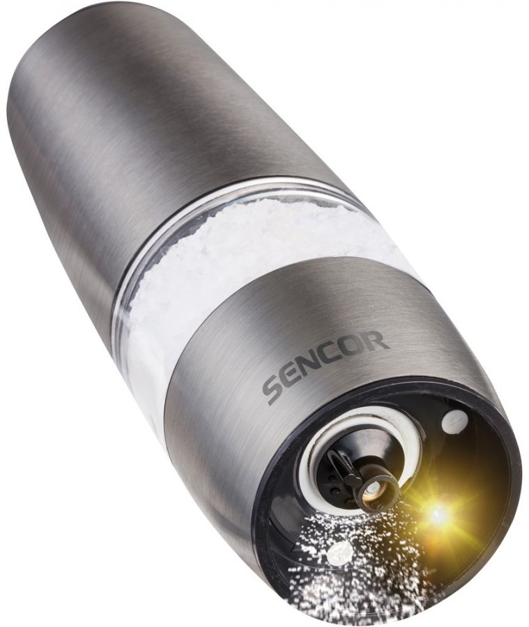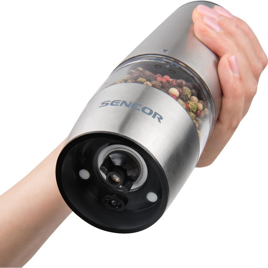 Mlýnek na koření má snadné ovládání jednou rukou a reaguje na pouhé stisknutí tlačítka, otočný systém pro snadné nastavení hrubosti mletí a bílé osvětlení ve spodní části mlýnku.