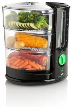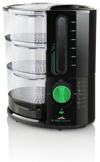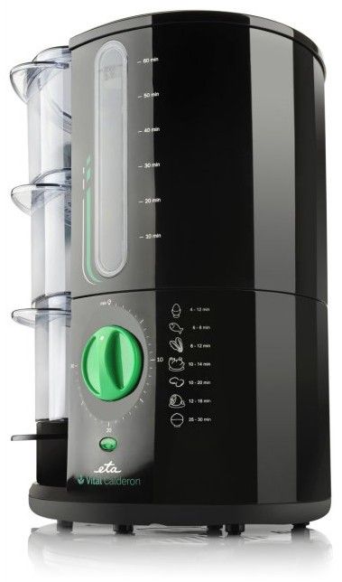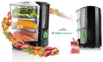 Parní hrnec ETA 1134 90000 Calderon Vital se třemi parními nádobami, který je velmi vhodný pro zdravý způsob vaření a tepelné přípravy jídel. Oproti běžným parním hrncům ETA Calderon Vital ušetří při vaření až 50% vašeho času a zároveň zachová důležité živiny a vitamíny. Díky své unikátní vertikální konstrukci zásobníku na vodu umí vytvořit dokonalou páru již za 30 sekund. Tím se ohřívá pouze malé množství vody a párá vzniká několika násobně rychleji a ve velkém množství. To urychlí přípravu pokrmů a nezamění přirozenou chuťpotravin. Uvaříte v něm snadno rýži nebo vejce na mnoho způsobů.