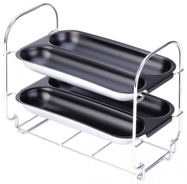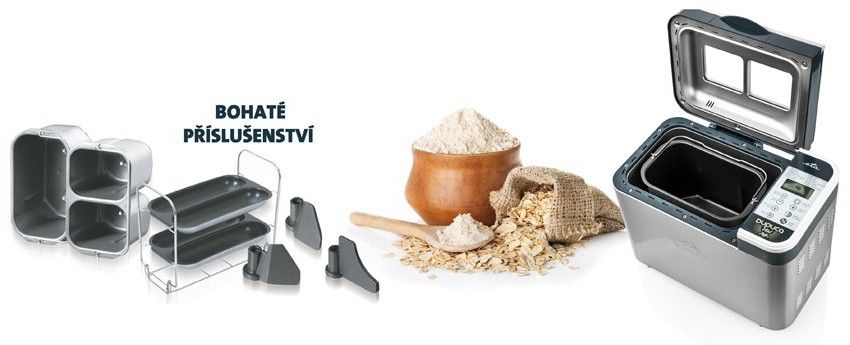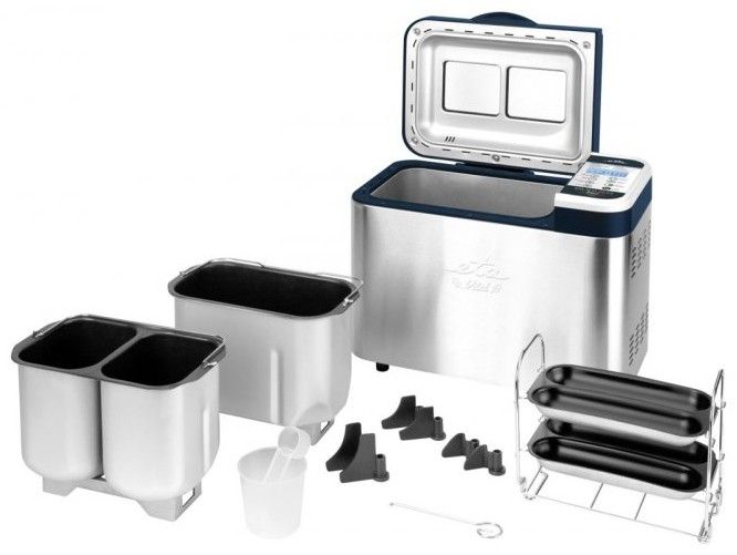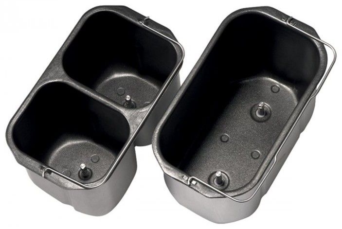 - Dvěma nádobami (jednokomorovou pro jeden velký nebo dvoukomorovou pro dva malé chleby) s nepřilnavou povrchovou úpravou zajišťující snadné vyjmutí upečeného chleba. Dvoukomorová nádoba umožňuje přípravu dvou druhů pečiva najednou