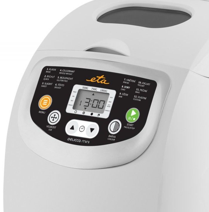 ETA Delicca 8149 90000 je malá multifunkční domácí pekárna, která potěší každou rodinu. Usnadní vám práci a připravíte s ní spoustu dokonalých pokrmů. Upečete jakýkoliv druh chleba, jako je bílý, pšeničný, žitný, celozrnný, chleba bezlepkový či sladký. Mimo to nabízí také programy pro přípravu těst, dortů, džemů či jogurtů. Můžete v ní hníst, kynout, péct nebo přihřívat bez nutnosti vašeho zásahu. Pekárna má také funkci automatického udržování teploty po dobu 60 minut.