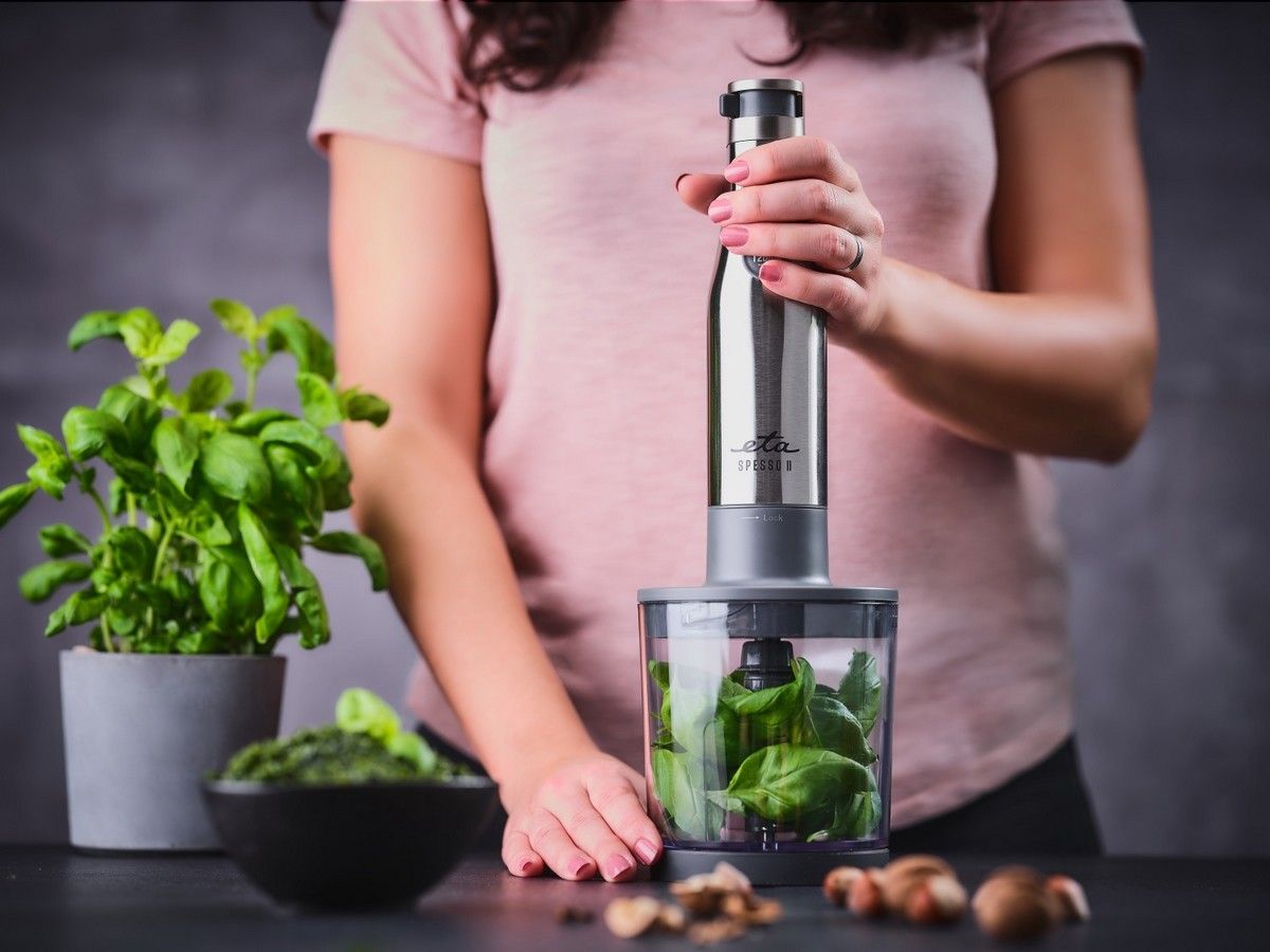 K práci mixér ETA Spesso II využívá sílu výkonného DC motoru s příkonem 1 200 W, díky kterému zvládne mixovat, šlehat, sekat i drtit. Během několika vteřin tak dosáhnete skvělých výsledků.