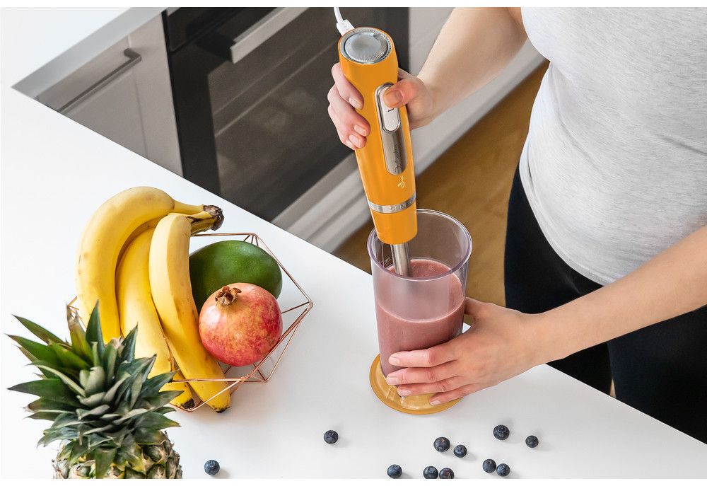 Na mou rukojeť lze nasadit hned několik nástavců. Jedním z nich je má tyčová hlavice pro mixování. Umím rozmixovat naprosto cokoliv, např. přesnídávky, měkké ovoce a zeleninu. Rozmixuji chutnou krémovou polévku, i když se zrovna vaří nebo libovolný nápoj na osvěžení či do fitka. Má nerezová hlavice je vybavena šesti kvalitními noži, které jsou též nerezové a mají titanový povrch. S kvalitou zpracování nožů, dokážu během mixování minimalizovat ztrátu vitamínů, minerálů a vlákniny.