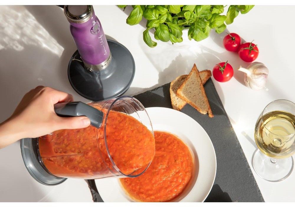 Nejdřív vás seznámím s nerezovým tyčovým nástavcem. Jeho velkou výhodou jsou čtyři vysoce kvalitní nerezové nože s titanovým povrchem. Přidejte k nim výkon a můžete mixovat čerstvé i vařené, jako jsou přesnídávky, kaše, polévky, krémy, ovoce, zelenina. Právě nože zapříčiňují uchování vysokého podílu živin v mixovaných potravinách. Ať už mixujete horké nebo studené, můžete se spolehnout, že vždy sníte plnohodnotné jídlo.