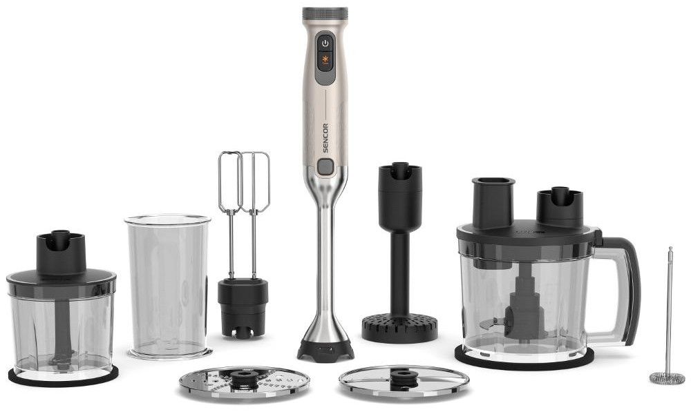 Tyčový ponorný mixér 4v1 s nerezovým nástavcem, příkonem 1 500 W a 25 rychlostmi.