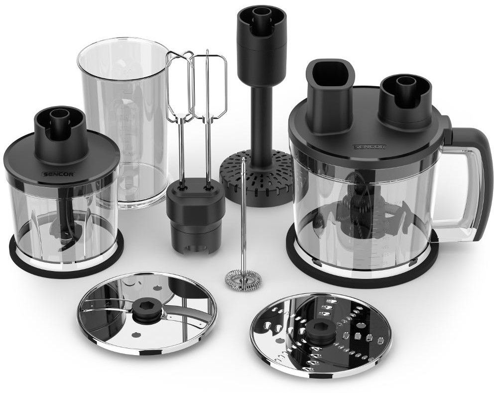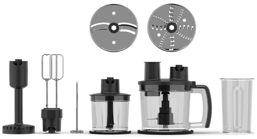 Příslušenství: Food processor s nádobou o objemu 1,5 l, 2 nerezovými čepelemi a 2 oboustrannými disky na strouhání a krájení, Dvojitá nerezová metla, Nástavec na bramborové pyré, rozebíratelný pro snadnější čištění, Nerezový napěňovač mléka, Nástavec na sekání s nádobou o objemu 500 ml, Odměrná mixovací nádoba o objemu 700 ml