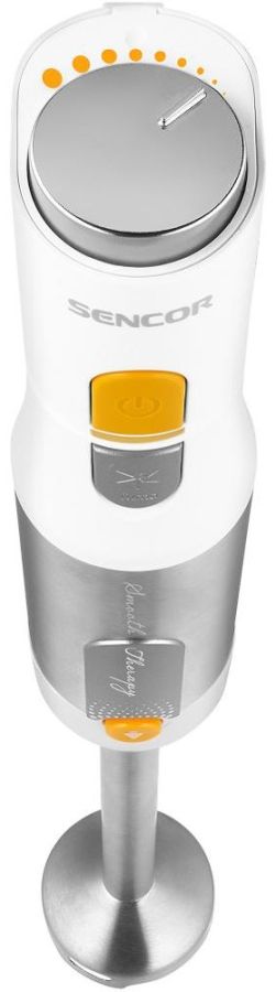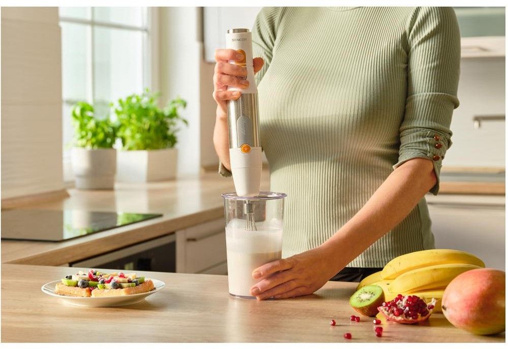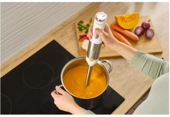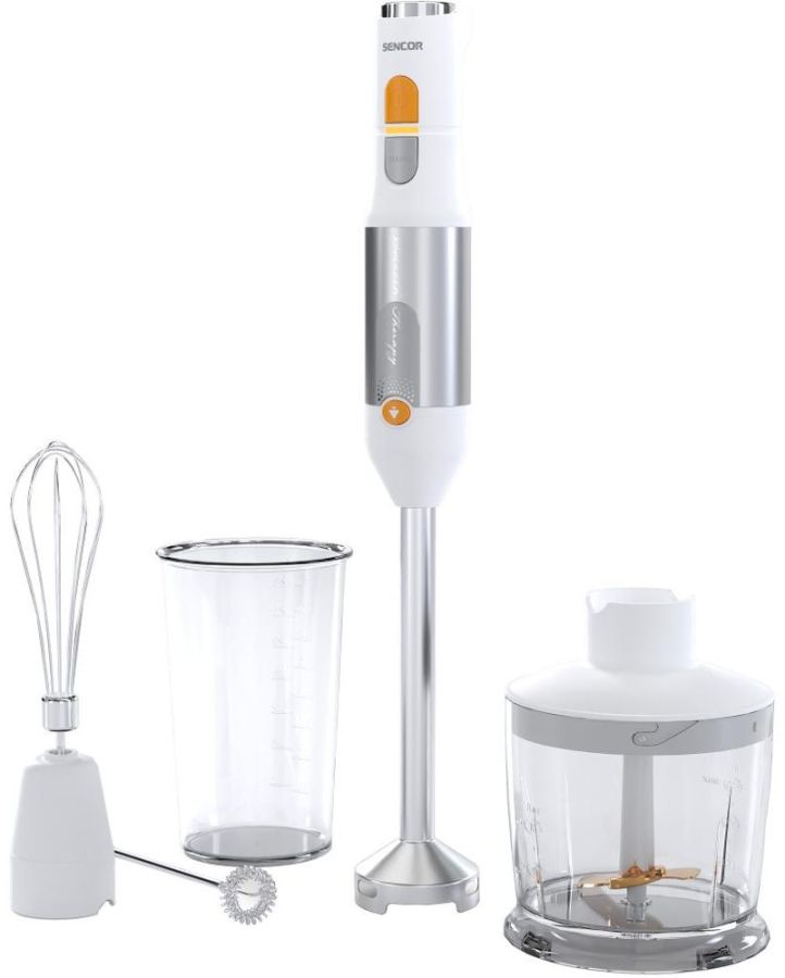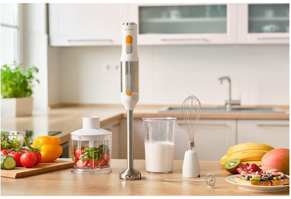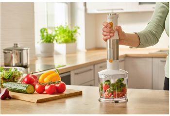 Tyčový ponorný mixér 5v1 s průběžnou regulací otáček, příkonem 1 200 W a ergonomicky tvarovanou rukojetí.
