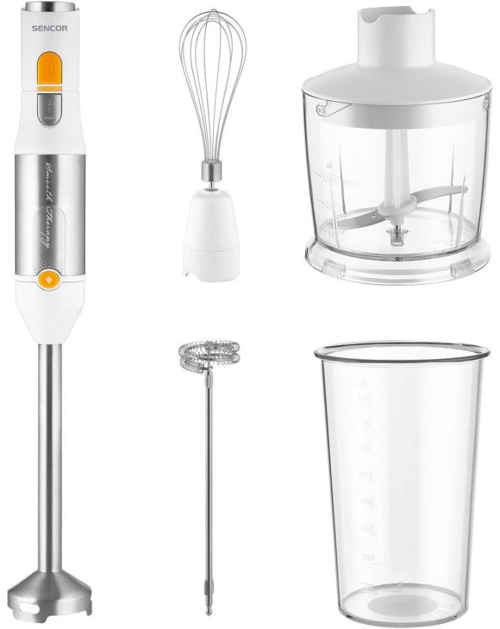 Příslušenství: Nádoba s víčkem o objemu 800 ml, Mačkač brambor, Šlehač z nerezové oceli, Mixér s noži z nerezové oceli a nádobou 500 ml, Tlačítka pro uvolnění příslušenství, Napěňovač mléka, Speciální flexibilní napájecí kabel