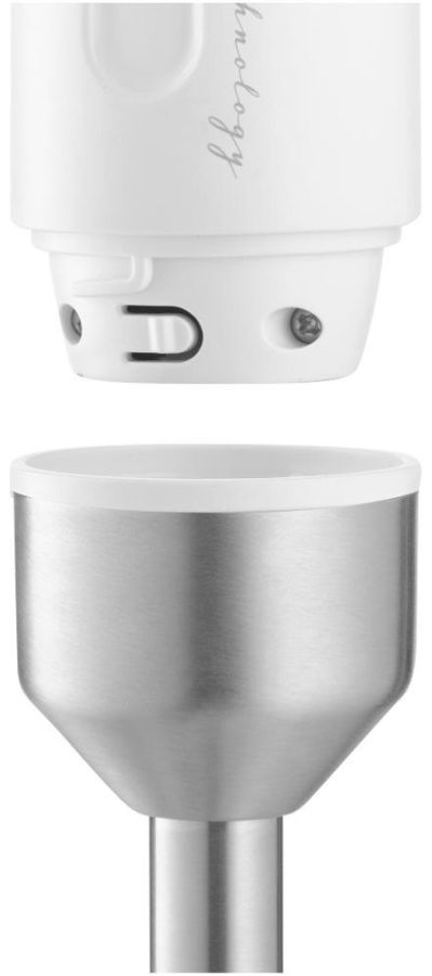 Aku tyčový ponorný mixér s 2 rychlostmi mixování, titanovým povrchem nožů a ukládací základnou.