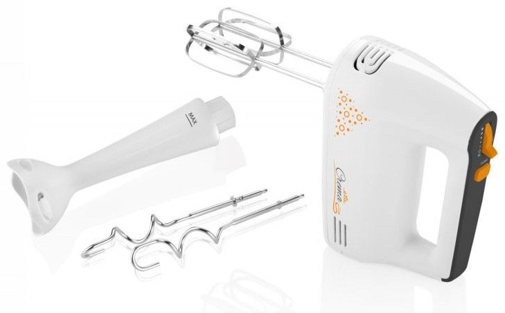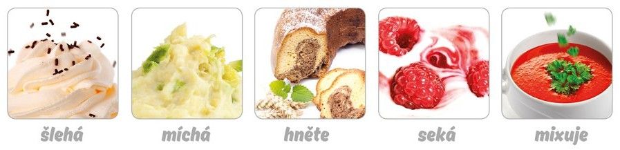 Ruční šlehač vhodný na šlehání, hnětení a mixování. Má 5 stupňů otáček, tlačítko TURBO a kvalitní nerezové metly a háky.