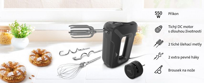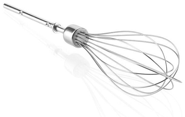 Bohaté příslušenství: 2 hnětací háky (o délce 200 mm), 2 dlouhé šlehací metly s inovovanou konstrukcí zajistí dokonalé zpracování surovin, velmi tichý chod a nepoškozují povrch nádoby, Šlehací metla (balónová), Brousek nožů