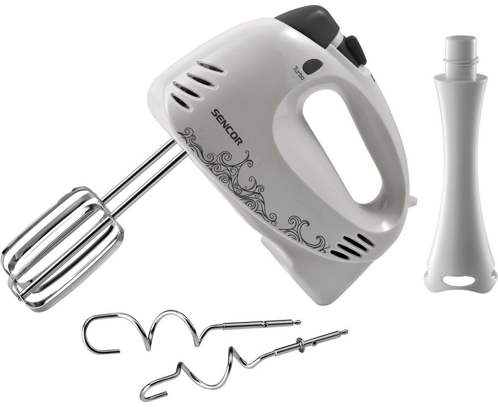 Ruční šlehač šlehá, hněte i mixuje. Má 5 stupňů otáček, tlačítko MAX a tyčový nástavec na mixování.