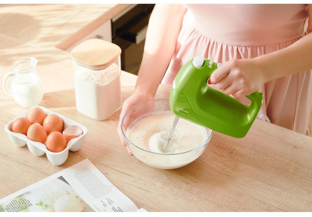 Ruční šlehač šlehá i hněte. Má 5 stupňů otáček a tlačítko Turbo.