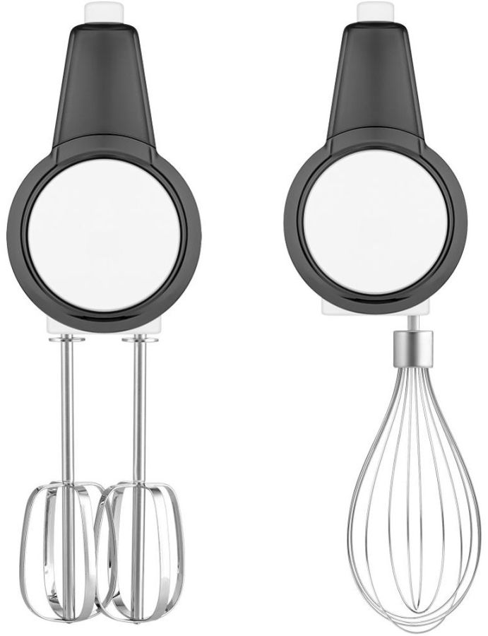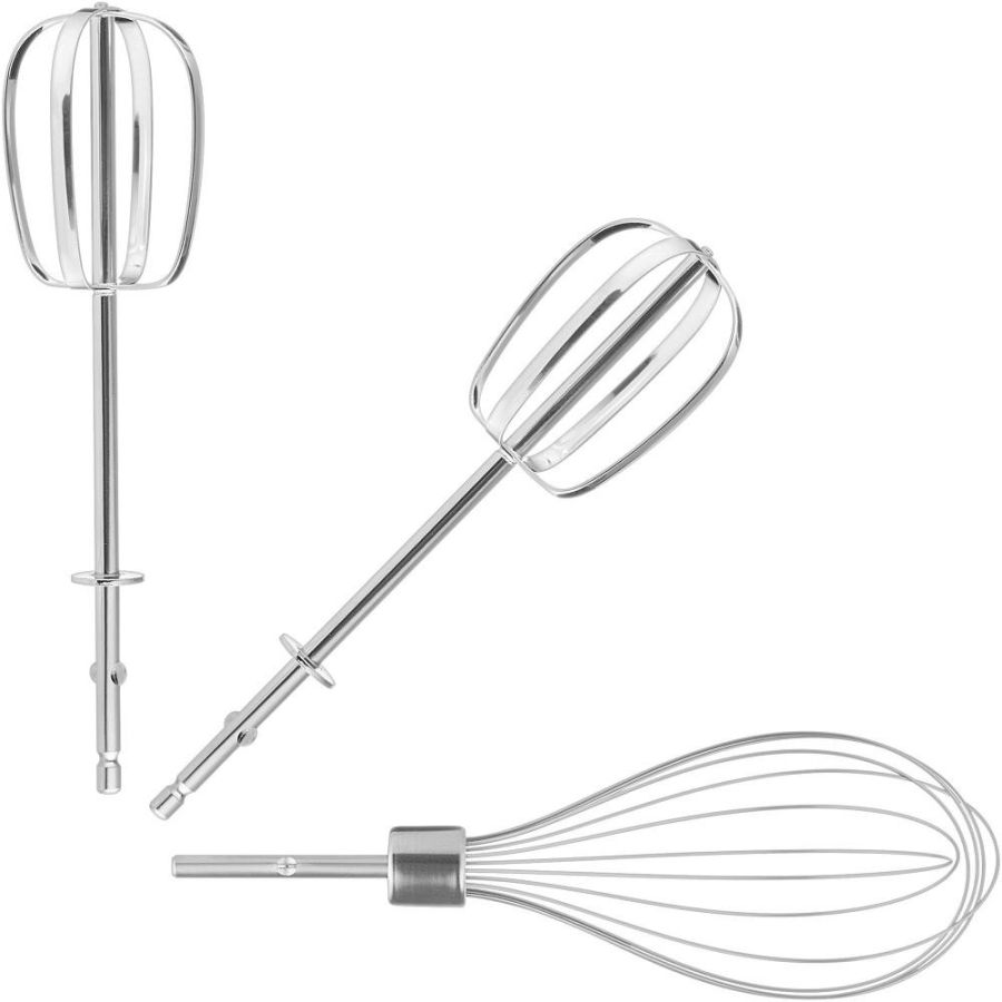 Příslušenství: Ruční šlehač, Ukládací základna, 2 chromované šlehací metly, Jedna velká nerezová metla, Nabíjecí adaptér, USB kabel
