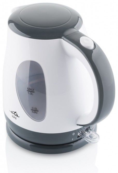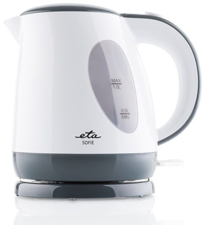 Plastová rychlovarná konvice Sofie o objemu 1 l vody. Má světelnou kontrolku provozu a skryté topné těleso.