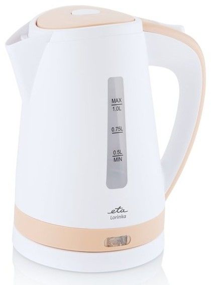 Plastová rychlovarná konvice Lorinka o objemu 1 l vody. Má oboustranný vodoznak, světelnou kontrolku provozu a skryté topné těleso.