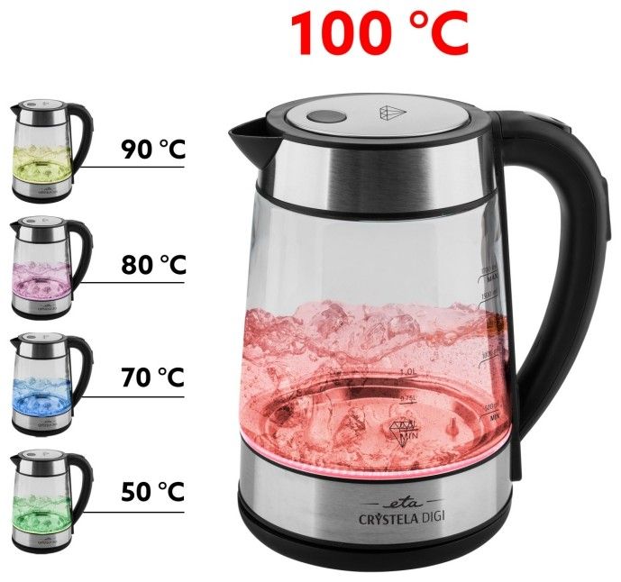 Rychlovarná konvice ETA CRYSTELA DIGI je ideální pro přípravu nejrůznějších druhů čaje, instantních nápojů, kaší nebo dětské stravy. Požadovanou teplotu můžete jednoduše nastavit pomocí intuitivního ovládání na držadle. Snadno si tak zvolíte mezi teplotou 50, 70, 80, 90 a 100 °C. Tím předejdete škodám, které by příliš horká voda napáchala například na pravém zeleném čaji, nebo se vyhnete dlouhému čekání, až vaše ranní ovesná kaše zchladne, abyste se konečně mohli pustit do jídla.