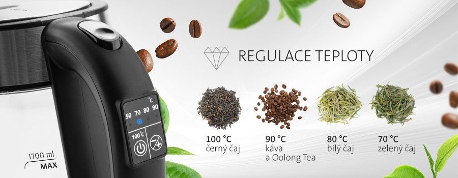 - Plynulá regulace teploty ohřevu vody 50, 70, 80, 90, 100 °C (ideální pro přípravu zeleného čaje, instantních nápojů nebo jídel, dětské stravy apod.)