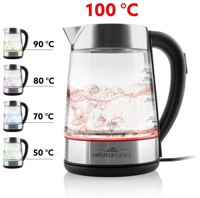 Rychlovarná konvice ETA CRYSTELA ESENCE je ideální pomocnicí pro milovníky sypaného čaje, a to nejen díky praktickému nerezovému sítku. Pomocí plynulé regulace teploty ohřevu vody na 50, 70, 80, 90 a 100 °C si snadno připravíte zelený, černý, bílý nebo ovocný čaj tak, aby byla jeho chuť plná a intenzivní. Jednotlivé teplotní stupně navíc doprovází měnící se barevné osvětlení, a tak je příprava oblíbeného nápoje snazší a zábavnější.