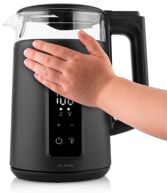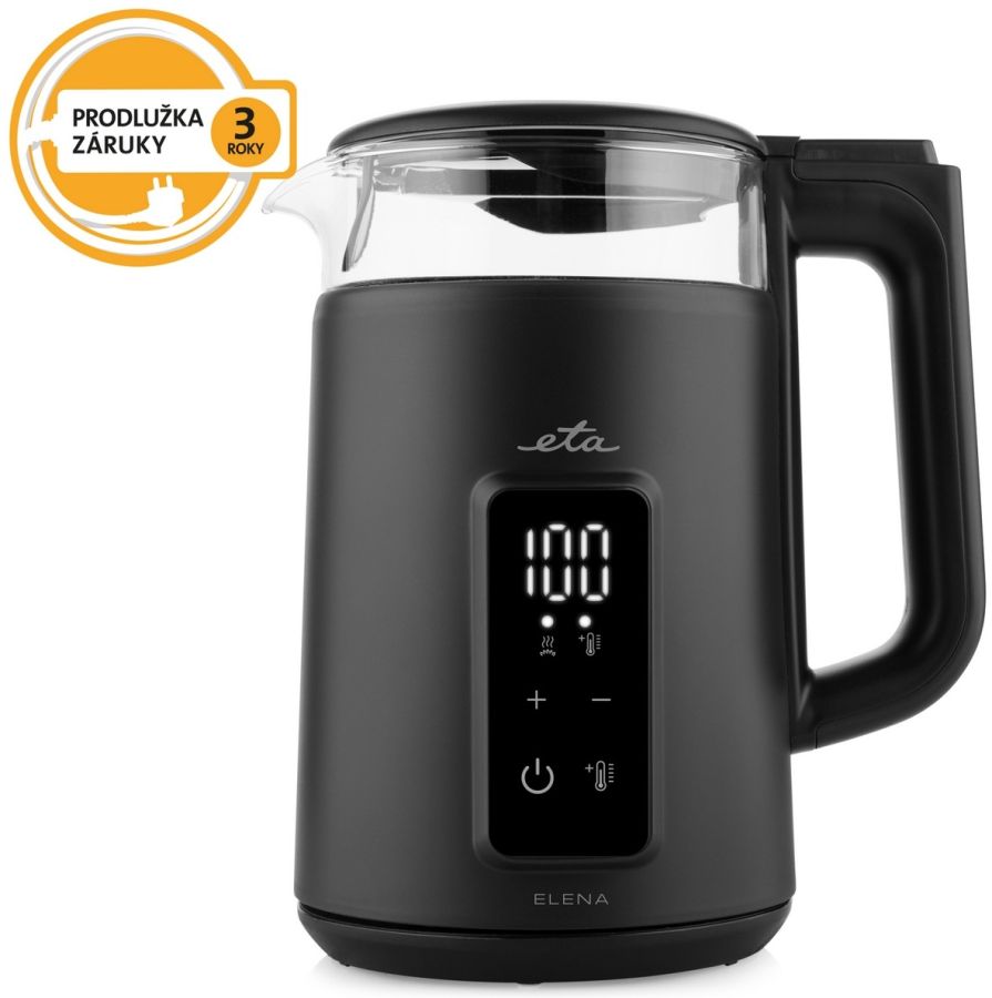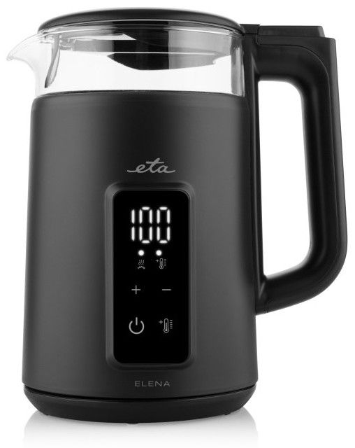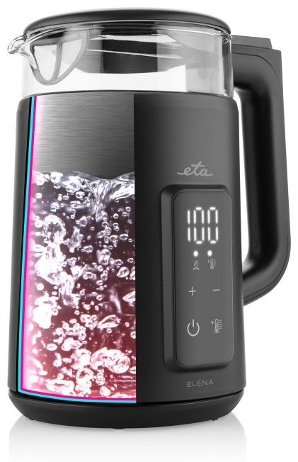Skleněná rychlovarná konvice ETA Elena ve dvouplášťovém provedení bude nejen praktickým, ale i stylovým doplňkem každé moderní kuchyně. Na přehledném LED displeji pohodlně sledujete aktuální teplotu vody, zatímco pomocí intuitivních dotykových tlačítek si jednoduše zvolíte přesně takovou teplotu, jakou právě potřebujete – od 40 do 100 °C.