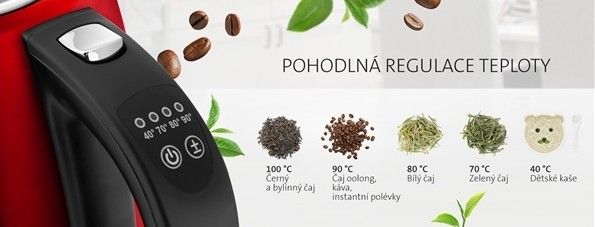 - Plynulá regulace teploty ohřevu vody 40, 70, 80, 90, 100 °C (ideální pro přípravu zeleného čaje, instantních nápojů nebo jídel, dětské stravy apod.)