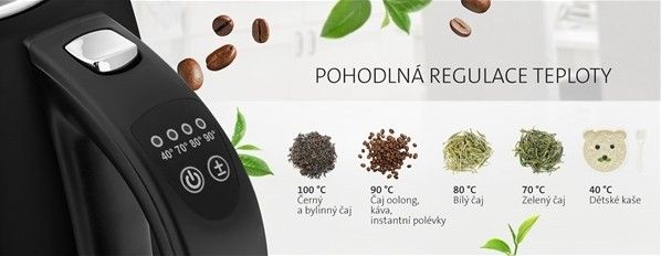 - Plynulá regulace teploty ohřevu vody 40, 70, 80, 90, 100 °C (ideální pro přípravu zeleného čaje, instantních nápojů nebo jídel, dětské stravy apod.)