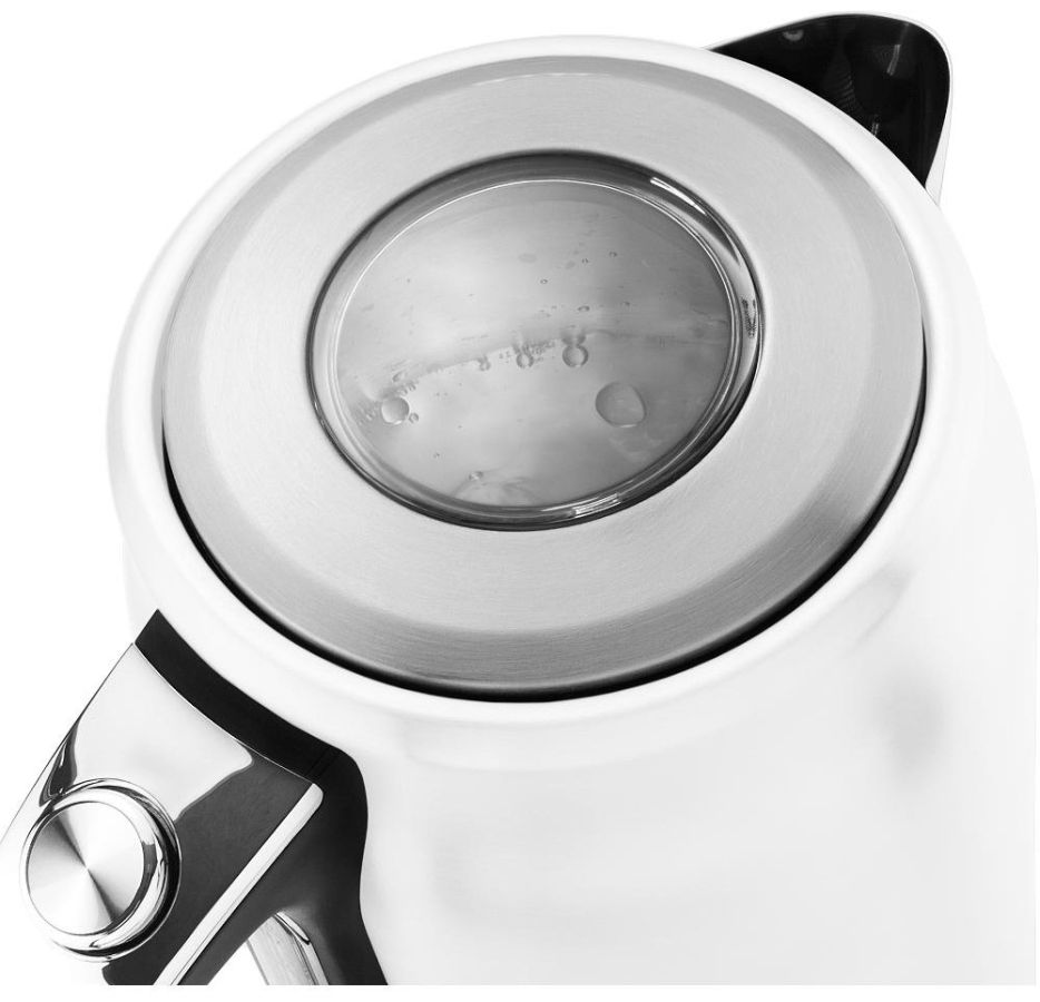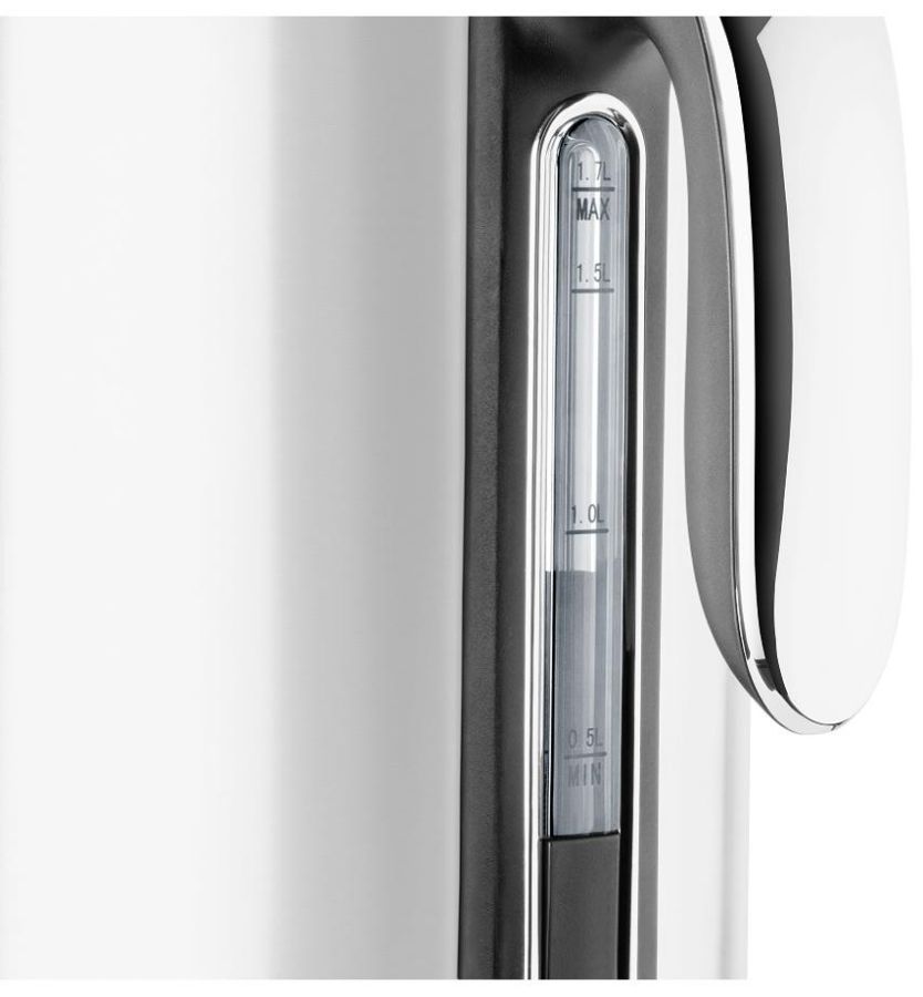 Nerezová rychlovarná konvice o objemu 1,7 l, vnější ukazatel množství vody, skryté topné těleso, středový konektor (360°) a vyjímatelný omyvatelný filtr proti usazeninám.