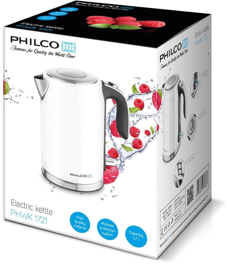 Líbivý a jednoduchý design je vlastnost, která vás zaujme na konvici Philco PHWK 1721 hned na první pohled. Po bližším prozkoumání zjistíte, že to je ale také perfektní zpracování, ergonomické držadlo, zdravotně nezávadné nerezové provedení a bezpečnostní prvky, které dělají z této konvice užitečného pomocníka do vaší kuchyně, kanceláře, nebo na hotelu. Světelný indikátor ve vypínači, průhledné víko a zakrytá topná spirála jsou jen dalšími milými detaily, které určitě oceníte.