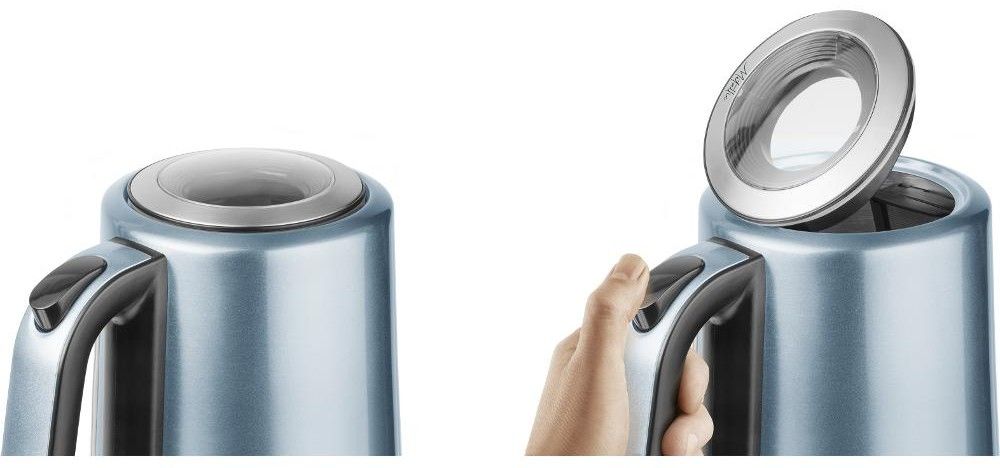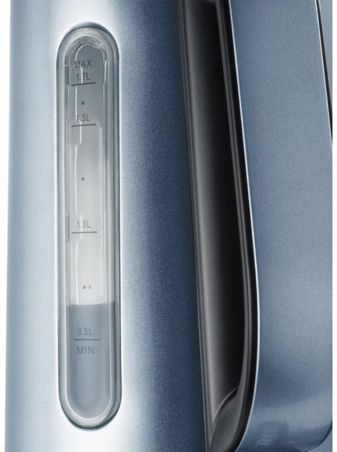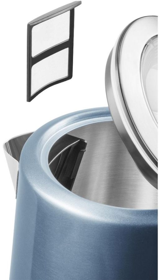 Nerezová rychlovarná konvice o objemu 1,7 l, vnější ukazatel množství vody, skryté topné těleso, středový konektor (360°) a vyjímatelný omyvatelný filtr proti usazeninám.