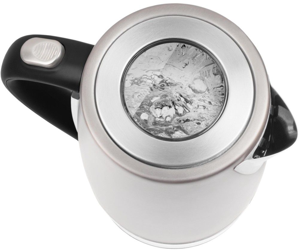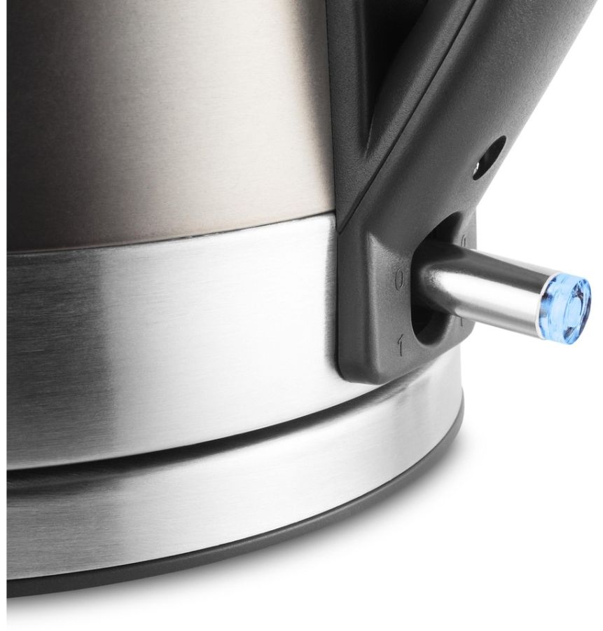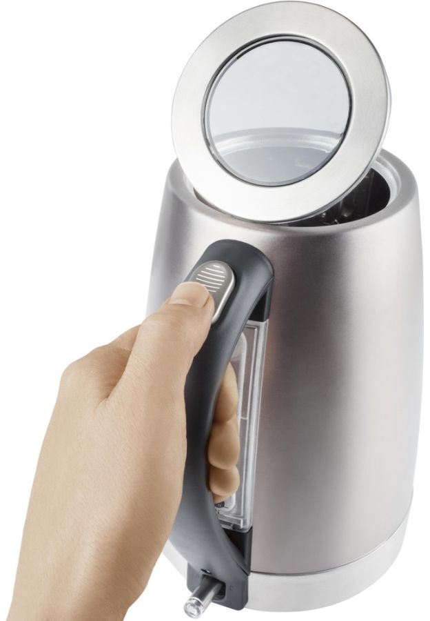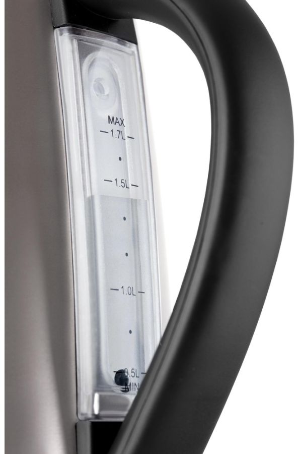 Nerezová rychlovarná konvice o objemu 1,7 l, vnější ukazatel množství vody, skryté topné těleso, středový konektor (360°) a vyjímatelný omyvatelný filtr proti usazeninám.