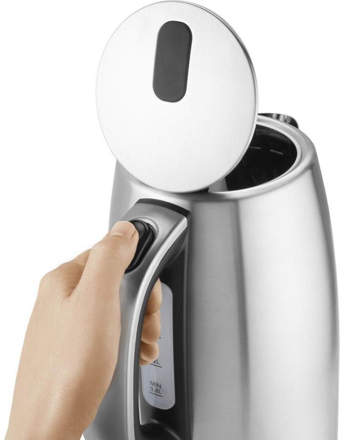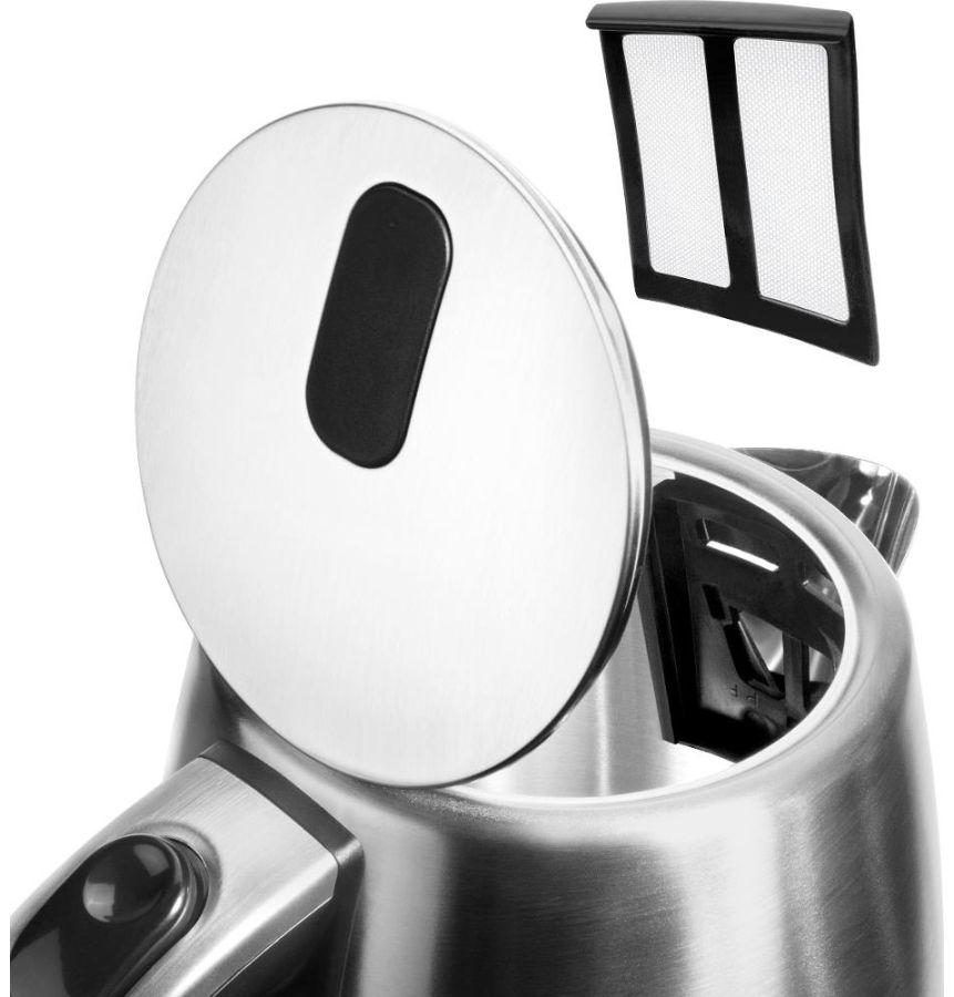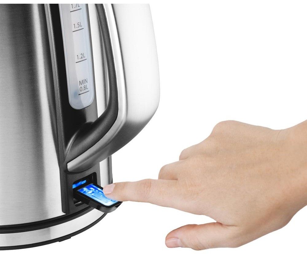 Rychlovarná konvice o objemu 1,7 l s LED kontrolkou provozu, skrytým topným tělesem a ukazatelem hladiny vody.