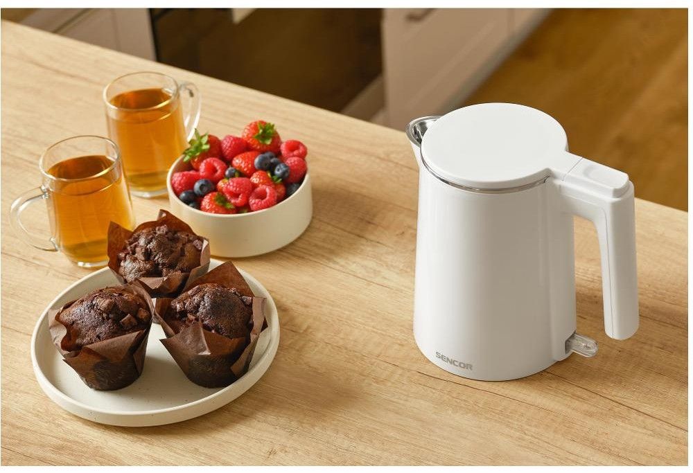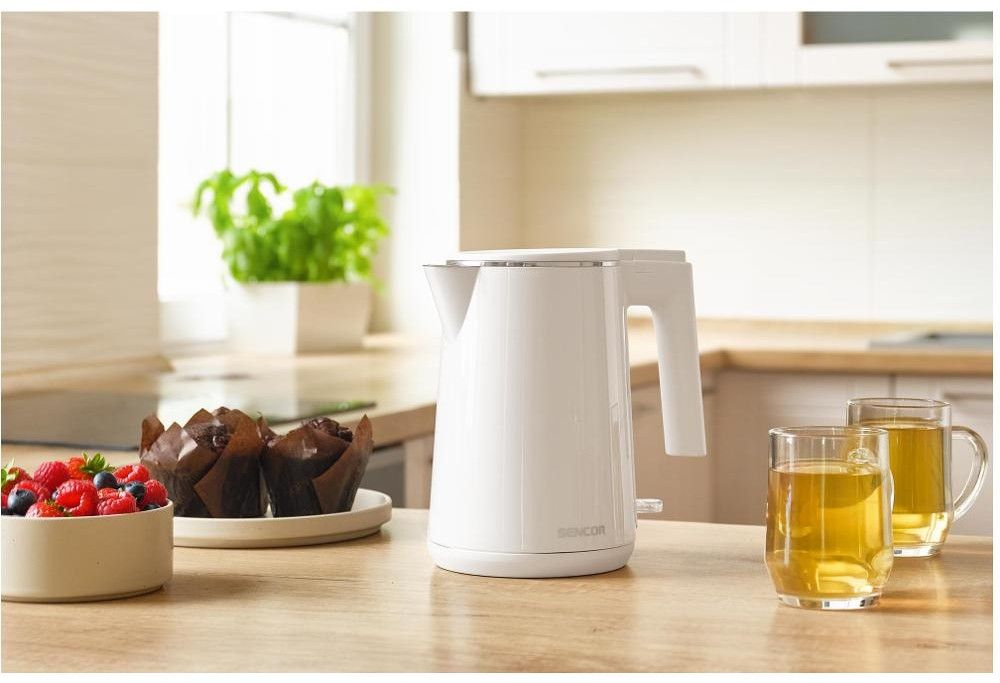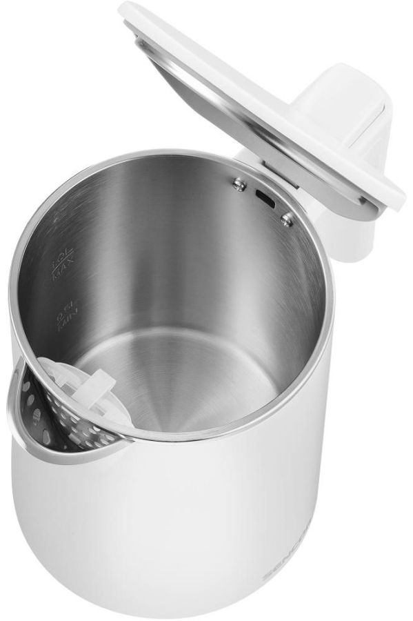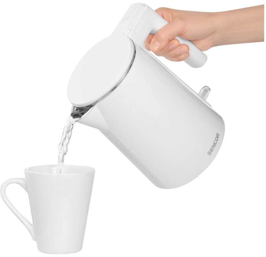Rychlovarná konvice o objemu 1 l. Má interní ukazatel hladiny vody, vypínač s podsvícením a skryté topné těleso.