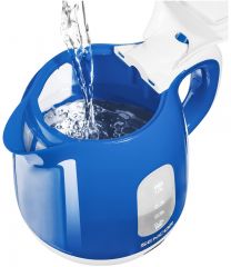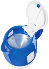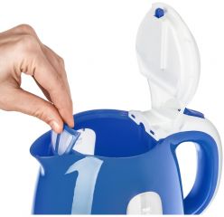 Plastová rychlovarná konvice o objemu 1 l. Má oboustranný vodoznak, dvojnásobné bezpečnostní jištění, světelnou signalizaci provozu a skryté topné těleso.