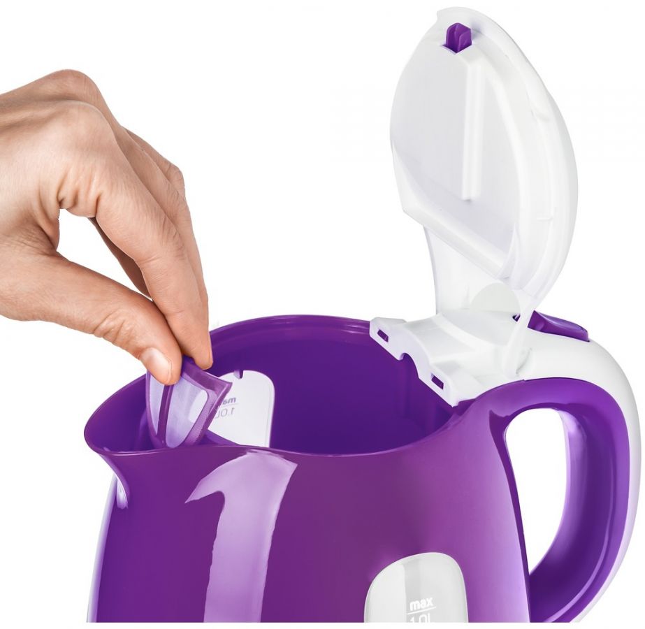 Plastová rychlovarná konvice o objemu 1 l. Má oboustranný vodoznak, dvojnásobné bezpečnostní jištění, světelnou signalizaci provozu a skryté topné těleso.