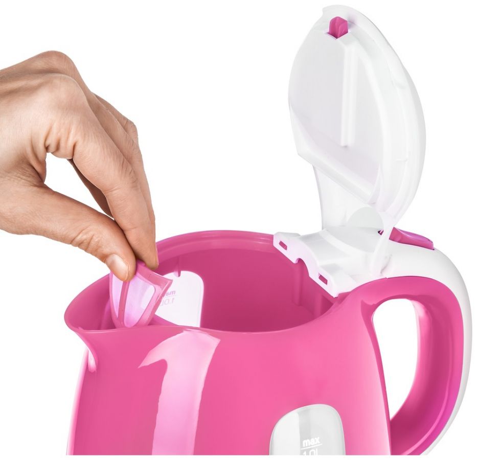 Plastová rychlovarná konvice o objemu 1 l. Má oboustranný vodoznak, dvojnásobné bezpečnostní jištění, světelnou signalizaci provozu a skryté topné těleso.